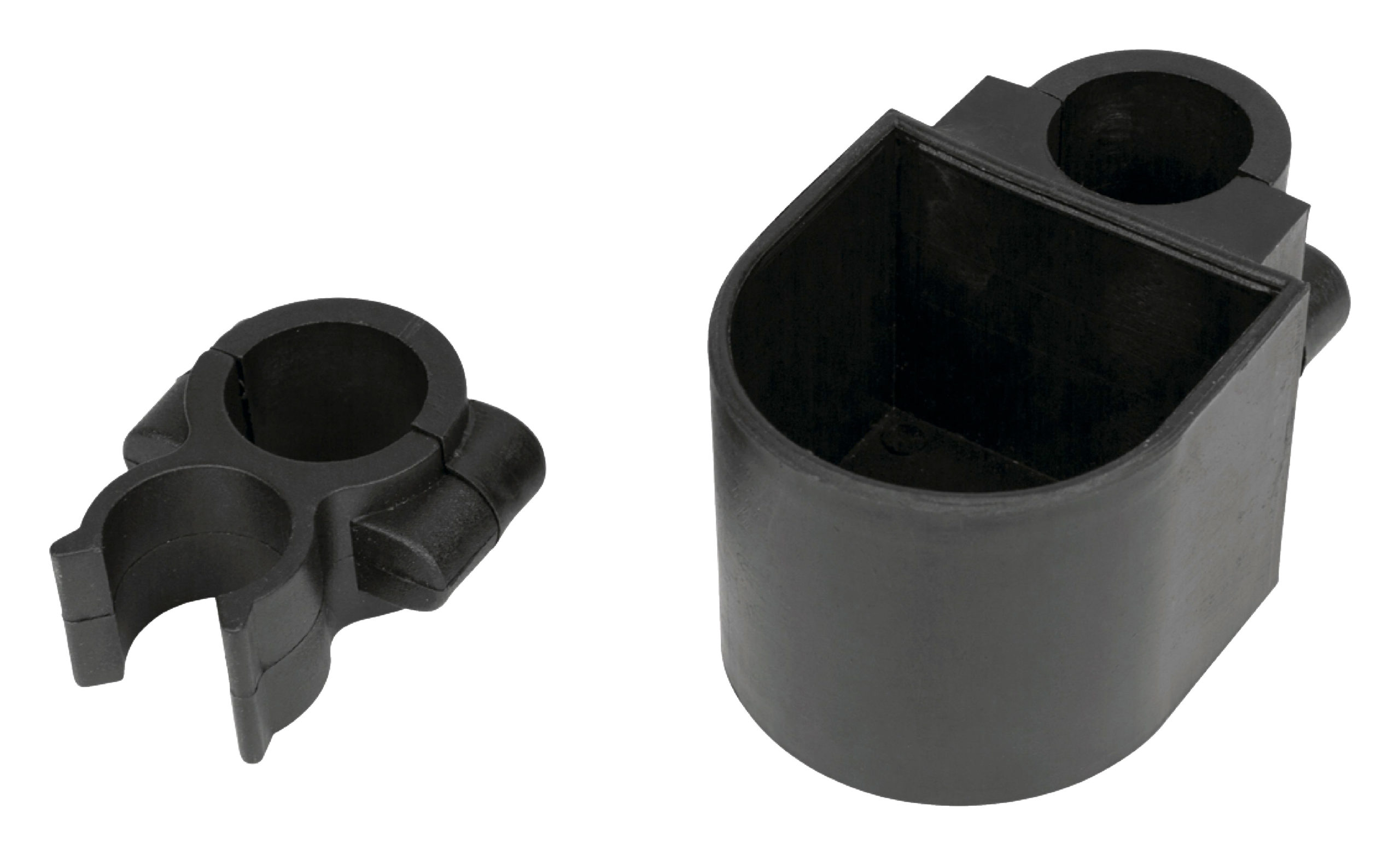 Il peut être positionné à gauche ou à droite. Ce porte-cannes est composé de 2 parties : un support supérieur avec clip de serrage et un support inférieur pour le pied de la canne.
