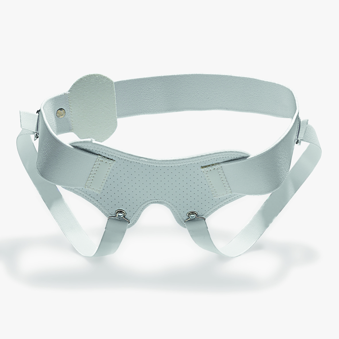 Bande pour hernie inguinale, bilatérale, deux pelotes amovibles et double courroie de cuisses.