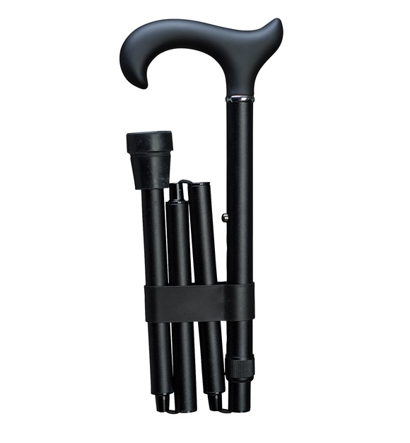 Canne de marche pliable en 4 parties. Facilement réglable en hauteur. Design et finition soignés. Poignée Derby ergonomique et antidérapante. Tube en aluminium renforcé (finition satiné). Embout de protection intégré. Anneau de protection en laiton