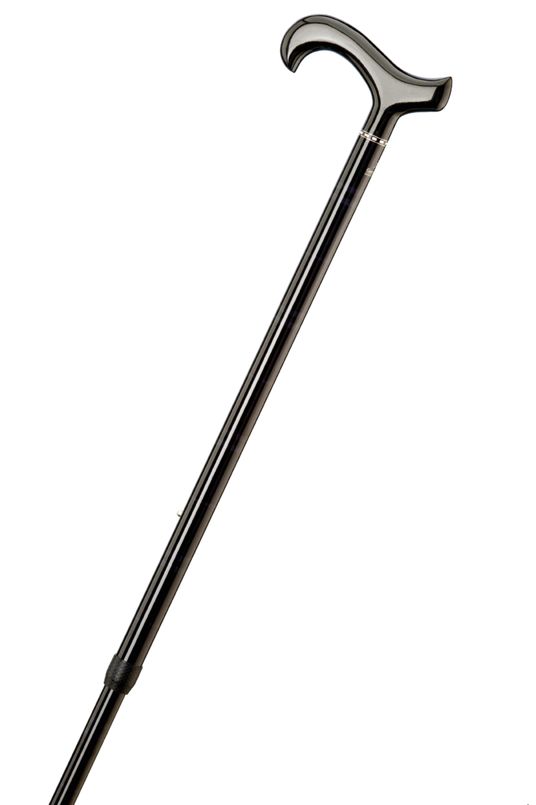 Canne de marche légère en carbone avec poignée noire Derby. Réglable en hauteur avec finition quadrillée mate. Avec tampon en caoutchouc.