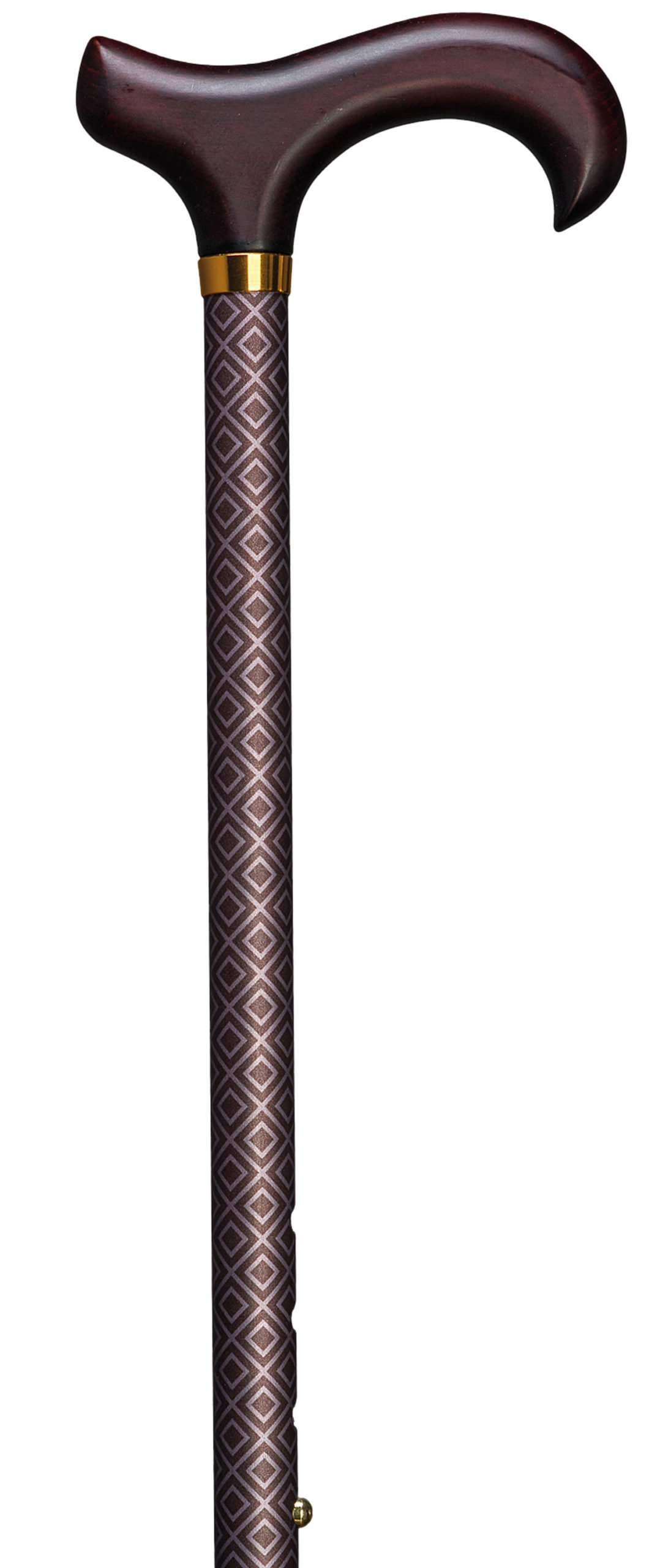 Canne de marche robuste en aluminium avec poignée Derby en bois. Réglable en hauteur avec une finition diamant moderne mate. Avec bague en laiton et tampon en caoutchouc.