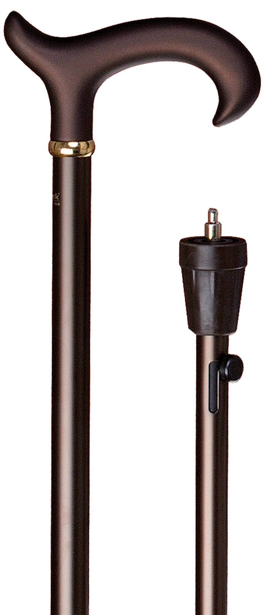 Canne de marche en aluminium mince avec poignée Derby en acétate et revêtement velouté. Réglable en hauteur avec finition satinée. Avec bague en laiton et tampon en caoutchouc. Pic à glace intégré.
