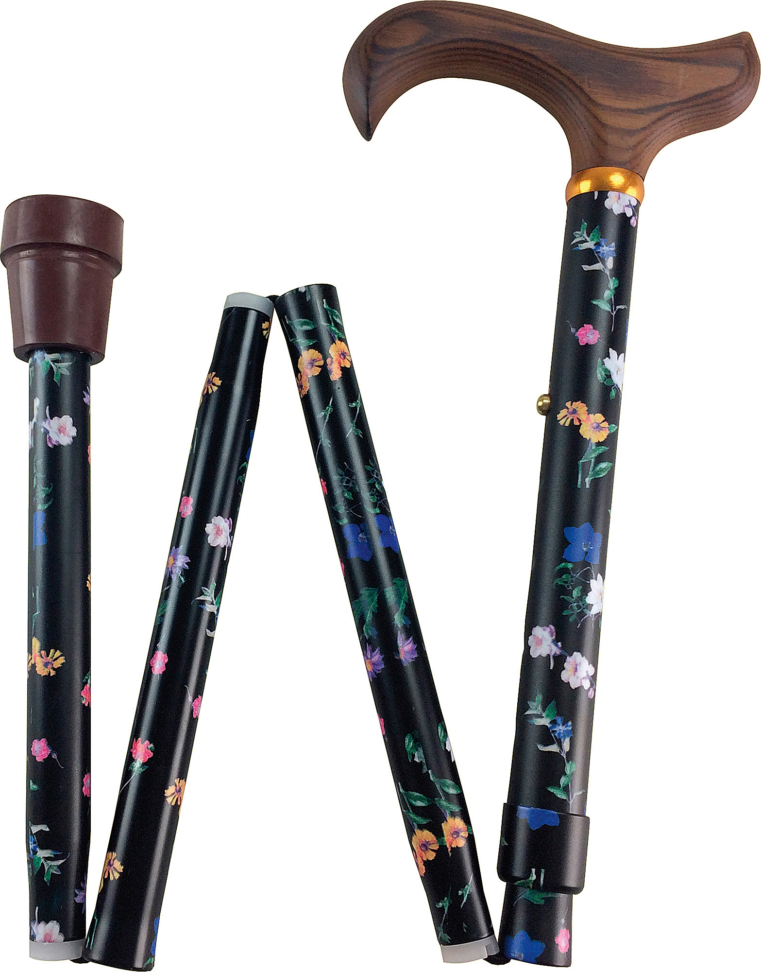 Canne pliable en 4 parties, en aluminium, poignée Derby en bois.