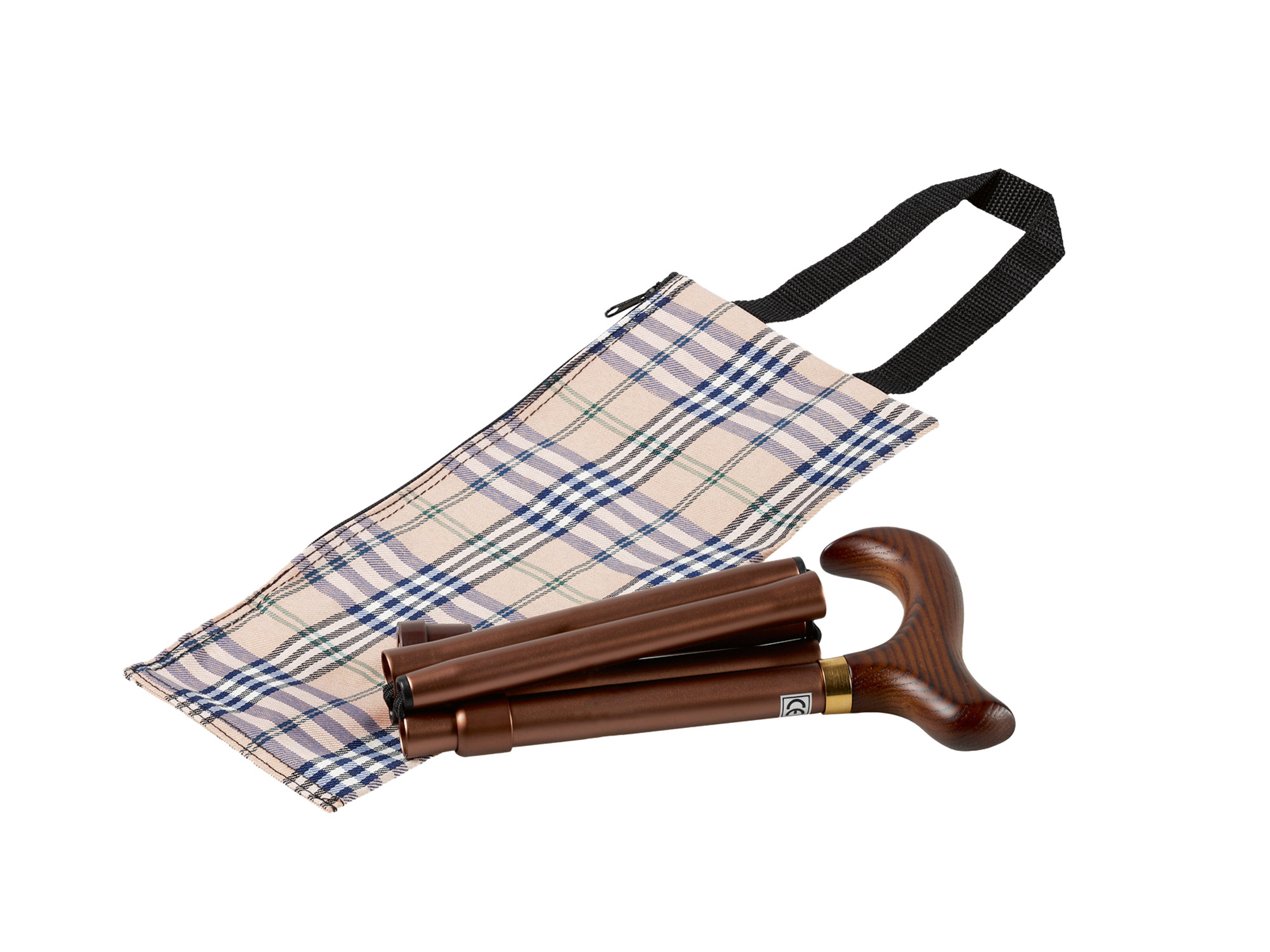 Canne pliable et robuste en aluminium avec poignée Derby en bois. Réglable en hauteur en finition brillante. Avec bague en laiton, tampon en caoutchouc et étui transparent.
