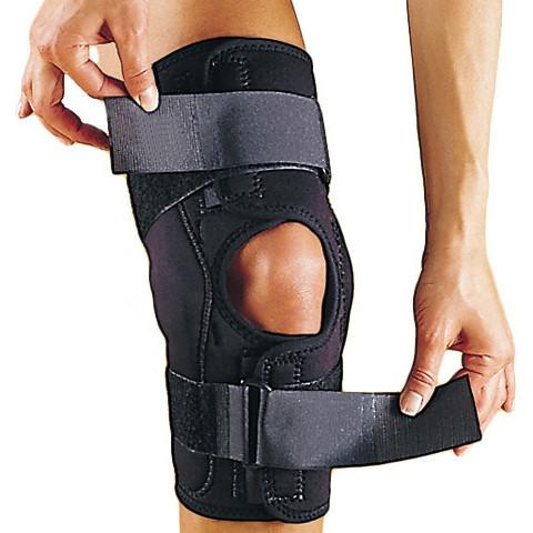 Bandage pour le genou en néoprène, renforcement latéral et médial, avec bandes de soutien supplémentaires à la partie distale et proximale.