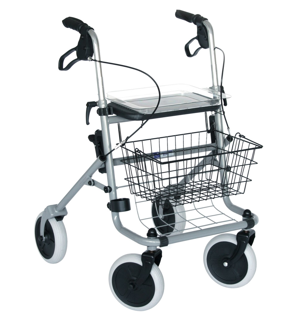 Rollator très robuste grâce à son châssis en acier, ses poignées réglables en hauteur et facilement pliable. Fourni avec : siège, plateau, panier et porte-cannes.