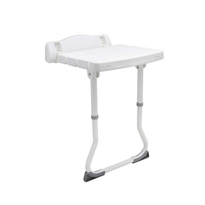 Siège de douche, avec pied de soutien. Surface antidérapante. Matériel : aluminium, plastique.