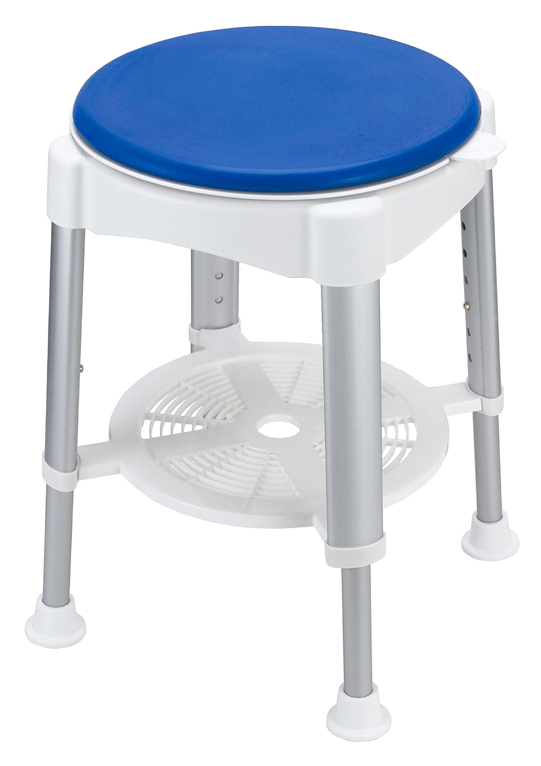 Tabouret de douche avec siège pivotant. Hauteur réglable. Matériel : aluminium, plastique.